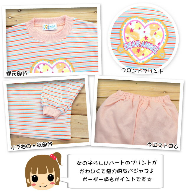 【特 長】 ・ボーダー柄 ・ハートエンブレムプリント ・ウエストゴム ・袖口リブ 【素 材】 ・(本体) ポリエステル80% 綿20% ・(リブ部分)ポリエステル95% ポリウレタン5% 【サイズ】 着丈 身幅 肩幅 袖丈 【100】 38 36 32 26 【110】 41 38 33 30 【120】 44 39 35 34 ※パンツは各サイズに適合した大きさとなります。