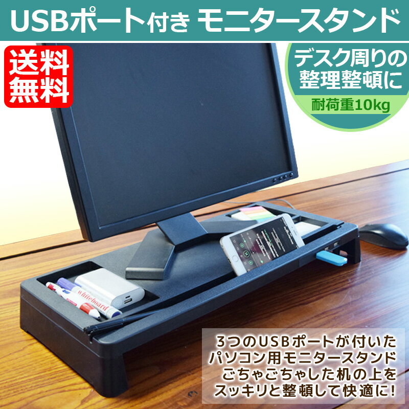 3つのUSBポートが付いたモニタースタンド! 机の上をスッキリと整頓して快適に! 何かとスペースが足りなくなりがちなデスク上をスッキリ整理整頓してくれる便利なモニタースタンドです。
