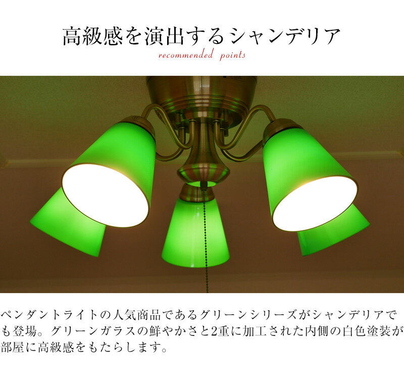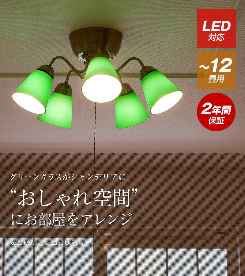 プルスイッチ式:全灯→3灯→2灯→消灯 (壁スイッチをONにしてからご使用ください) 適応畳数:〜12畳適応畳数 6畳・8畳・10畳・12畳 サイズ 長さ約50cm×幅約50cm×高さ28cm(チェーン除く) 重量 本体:1500g シェード:1200g 素材 本体:スチール、シェード:ガラス(2重ガラス) カラー 本体:古美色 ガラス:グリーン 消費電力 E-26 60W×5(フロスト電球) 使用電球 E26(60WLED電球付属)